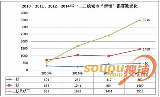 2010-2014年一二三線城市“新增”銀幕數(shù)變化