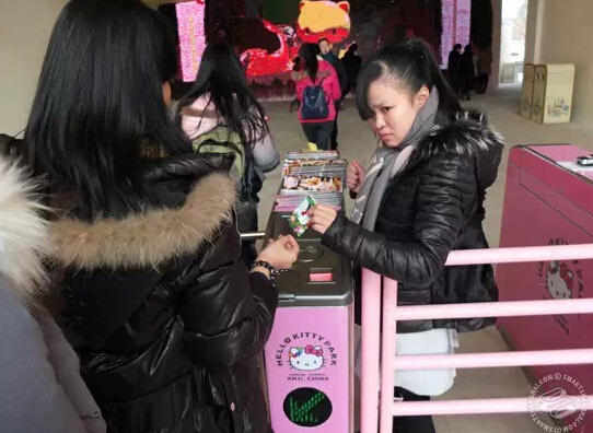 終于到了公園,才得知因?yàn)檫在試營(yíng)業(yè),大部分的游戲項(xiàng)目都在不對(duì)外開放。門口到處是兜售盜版 Hello Kitty 的小販。還有這臺(tái)很莫名的游戲機(jī),里面大概有一半的玩具根本不是來自 Hello Kitty 的宇宙。