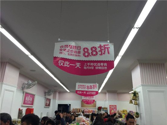 吊頂上顯著的促銷吊旗,雖然顯得清雅,但也在告訴大家,只要是每月的8號,就能享受8.8折的優(yōu)惠。之所以今天能呈現(xiàn)如此火爆的場面,完全就是因為這個8.8折的刺激?吹酱,我們應(yīng)該提醒自己:會員營銷依舊是最有力的途徑之一!