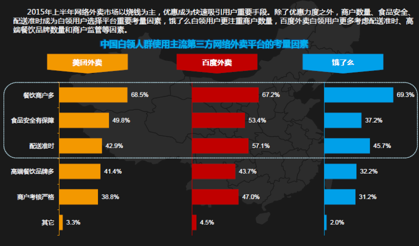 外賣(mài)O2O市場(chǎng)中,白領(lǐng)的人群畫(huà)像為高頻、高單價(jià)消費(fèi)、高黏性、對(duì)價(jià)格不敏感,并且對(duì)物流準(zhǔn)時(shí)配送,品質(zhì)以及多元服務(wù)有著更大的訴求。當(dāng)補(bǔ)貼大戰(zhàn)消退之后,白領(lǐng)市場(chǎng)所受的影響會(huì)最小,而未來(lái)更大的增長(zhǎng)點(diǎn)也將繼續(xù)集中在白領(lǐng)市場(chǎng),而目前在百度外賣(mài)、美團(tuán)外賣(mài)、餓了么的三分天下格局中,百度外賣(mài)比同類(lèi)競(jìng)品在各方面都更為領(lǐng)先一些,有著更大的市場(chǎng)潛力。