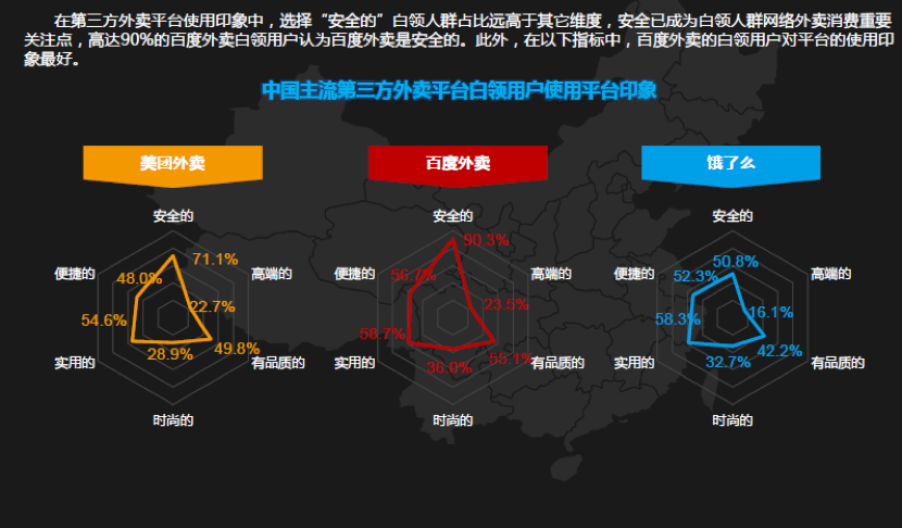 在調(diào)查中,白領(lǐng)用戶最關(guān)心的六個(gè)維度分別是高端、品質(zhì)、安全、時(shí)尚、實(shí)用、便捷,其中高達(dá)90.3%的百度外賣(mài)白領(lǐng)用戶認(rèn)為百度外賣(mài)是安全的,美團(tuán)外賣(mài)次之,餓了么則相對(duì)分?jǐn)?shù)較低。