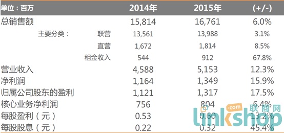 聯(lián)商網(wǎng)消息:3月22日(今日),銀泰商業(yè)集團(tuán)發(fā)布2015年度業(yè)績報(bào)告,報(bào)告顯示,公司2015年總銷售額增至167.6億元人民幣,同比上升6.0%;歸屬母公司凈利潤13.2億元人民幣,同比上升17.5%;同店增長0.5%,零售收入增至51.5億元人民幣,同比上升12.3%;核心業(yè)務(wù)凈利潤8億元人民幣,同比上升6.4%。