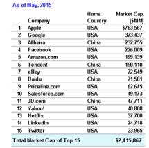 ——作為一種經(jīng)濟(jì)現(xiàn)象:KPCB整理的2015年5月市值前15大的互聯(lián)網(wǎng)公司,市值總和高達(dá)2.4萬(wàn)億美元,平臺(tái)已經(jīng)成為了全球經(jīng)濟(jì)中重要的經(jīng)濟(jì)力量。哈佛大學(xué)托馬斯?艾斯曼的研究也發(fā)現(xiàn),全球最大100家企業(yè)有60家企業(yè)主要收入來(lái)自平臺(tái)商業(yè)模式。