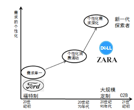 回望現(xiàn)代商業(yè)模式的演變,在發(fā)達(dá)國(guó)家,自60年代特別是70年代以后,發(fā)達(dá)國(guó)家大部分消費(fèi)品行業(yè)都轉(zhuǎn)變?yōu)榱速I方市場(chǎng),個(gè)性化消費(fèi)的需求也逐漸開(kāi)始大規(guī)模地出現(xiàn)。市場(chǎng)的變化,社會(huì)風(fēng)尚的轉(zhuǎn)變,讓大規(guī)模生產(chǎn)方式顯示出了越來(lái)越明顯的疲態(tài)。產(chǎn)消關(guān)系由此走向了極不平衡的狀態(tài)。企業(yè)為不可避免的庫(kù)存積壓備感困擾,往往只能求助于過(guò)度營(yíng)銷的手段,如垃圾短信、惡俗廣告等“過(guò)度營(yíng)銷”的手段。消費(fèi)者則在廠商和大眾媒體廣告的“共謀”下,被勸說(shuō)著要去及時(shí)行樂(lè),要習(xí)慣于用完就扔,是為消費(fèi)主義的濫觴。終于,自90年代開(kāi)始,大規(guī)模定制開(kāi)始受到各企業(yè)的追逐,典型如DELL公司。DELL創(chuàng)始人邁克爾·戴爾曾被認(rèn)為是近百年來(lái)最接近亨利·福特的人,但DELL也只是為消費(fèi)者提供了一種菜單式的有限選擇,而且也仍然傾向于讓消費(fèi)者適應(yīng)于企業(yè)既有的供應(yīng)鏈。