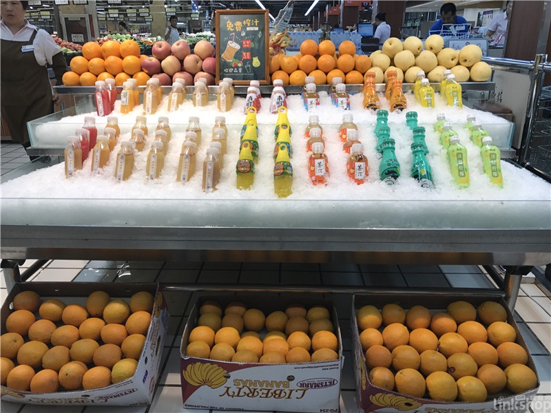 ▲這是河北省高碑店市家興商貿(mào)開發(fā)區(qū)店的100%鮮榨陳列,“趙蜀黍果汁”是家興企業(yè)的自有品牌,各種新鮮水果立視可見,或常溫或冷藏,而且榨出的果汁陳列在碎冰中,在讓消費(fèi)者品嘗到健康美味的同時(shí),能感受到炎熱夏天的一絲涼意。