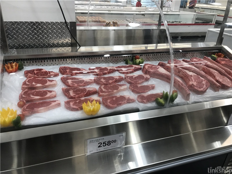 ▲而在7月26日開業(yè)的龍華山姆會(huì)員店,從美國(guó)進(jìn)口的牛肉陳列在透明玻璃柜中,底部由塑料紙隔著的冰臺(tái),周邊加上雕刻后的彩椒裝飾。這種陳列模式從衛(wèi)生角度考慮俱佳,但是亮感展示不夠。