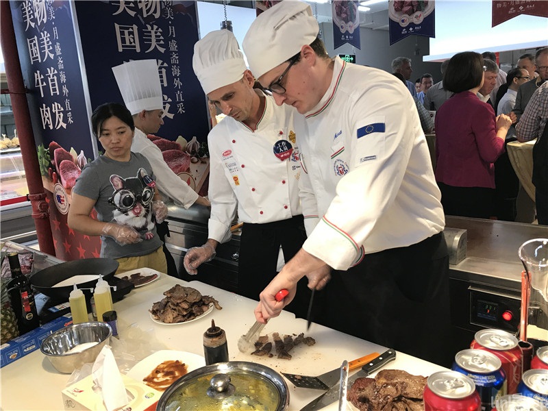 ▲7月26日物美在北京啟動(dòng)美國(guó)牛肉直采儀式,在門店牛肉的陳列更具國(guó)際范,每一個(gè)牛肉單品都是經(jīng)過精包裝,旁邊的美國(guó)大廚現(xiàn)場(chǎng)烹制牛肉,加上紅酒的點(diǎn)綴可謂是美女美酒美味。