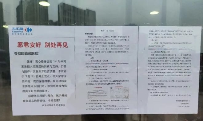 近日,家樂(lè)福蘇州人民北路店貼出公示,“因業(yè)主方經(jīng)營(yíng)調(diào)整,本店于3月31日停止?fàn)I業(yè)”。