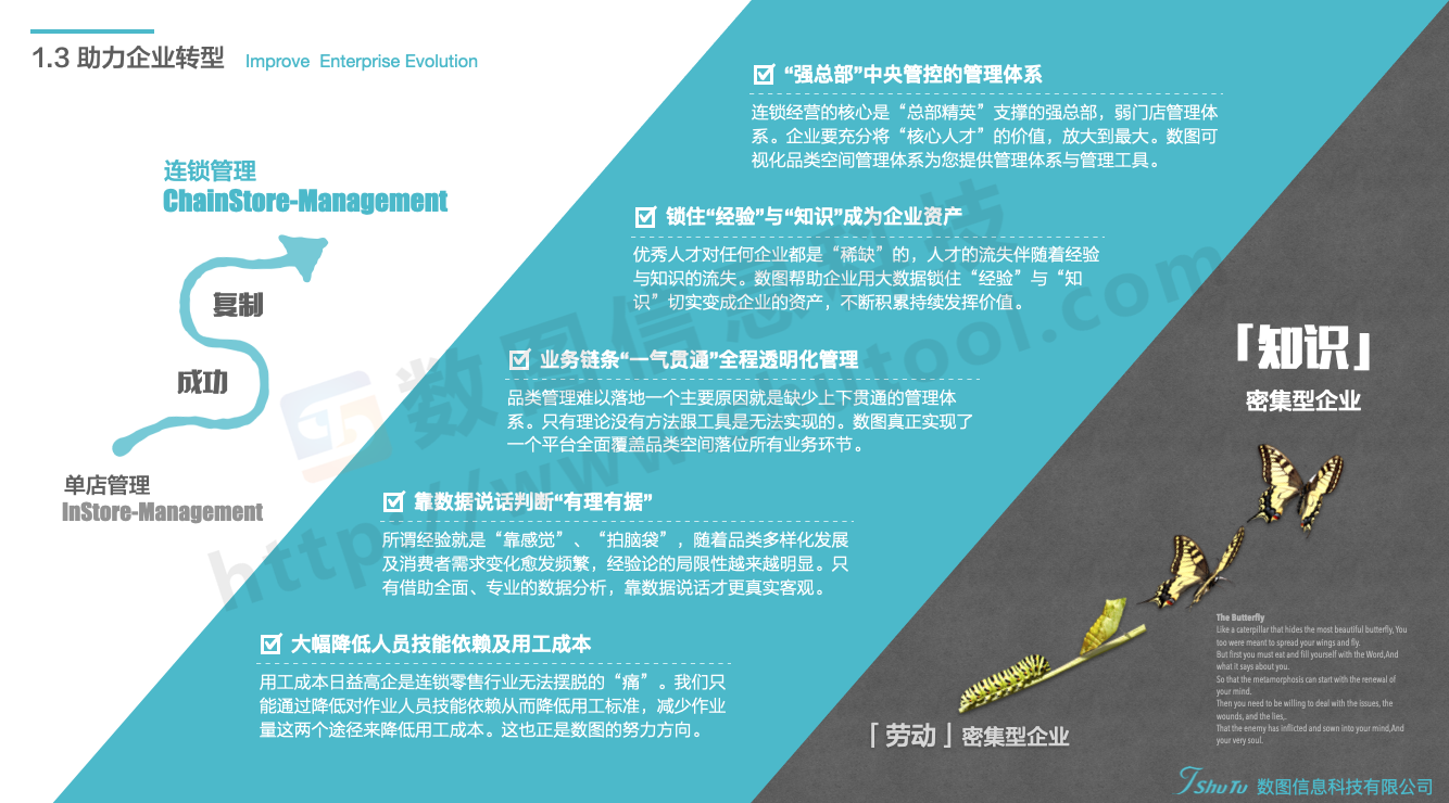 講到這里就可以總結(jié)一下了。企業(yè)管理中的決策支持體系,肯定不是一個(gè)單純技術(shù)的活,重要的是要嵌入科學(xué)的商業(yè)邏輯、商業(yè)模型。這些商業(yè)模型對(duì)業(yè)務(wù)的理解、支持能力真正體現(xiàn)了這套系統(tǒng)的水平和價(jià)值。如果說(shuō)這個(gè)領(lǐng)域有壁壘的話(huà),我想這些模型的打磨與完善才是真正的壁壘。沒(méi)有長(zhǎng)期的實(shí)踐,對(duì)行業(yè)、對(duì)業(yè)務(wù)深入的理解以及對(duì)技術(shù)知識(shí)、技術(shù)應(yīng)用的廣泛掌握是很難做到的。數(shù)圖核心團(tuán)隊(duì)在這個(gè)領(lǐng)域深耕十幾年,在企業(yè)數(shù)字化基礎(chǔ)建設(shè)方面積累了比較多的經(jīng)驗(yàn)。非常期待能夠?yàn)楦嗟钠髽I(yè)提供幫助,也非常期待與更多的同仁溝通交流、共同進(jìn)步。