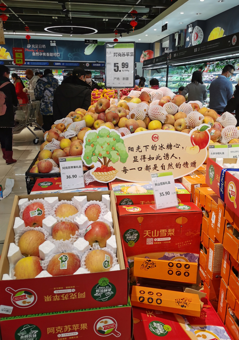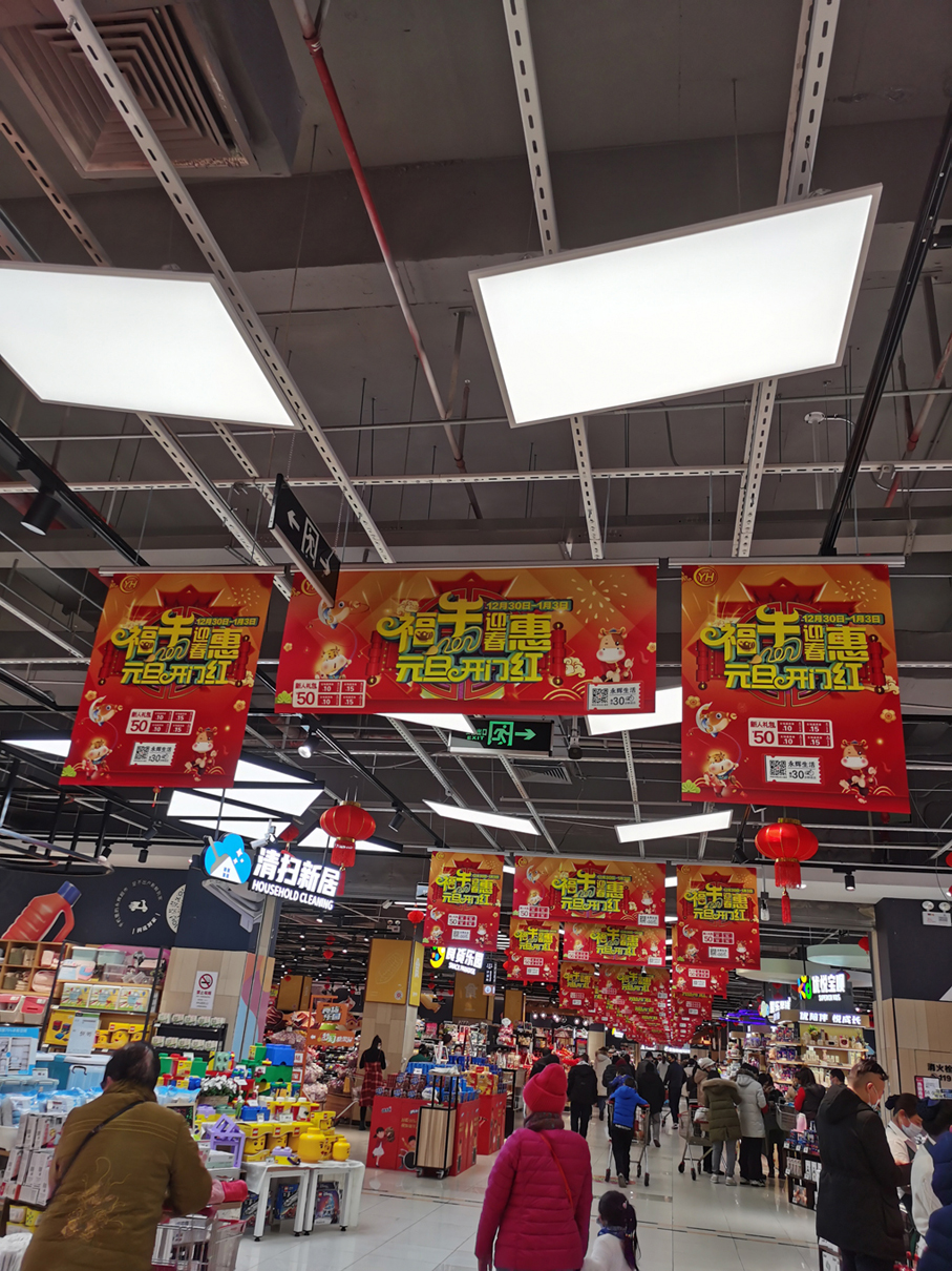 對比一下盒馬和胖東來的吊旗吊牌組合: