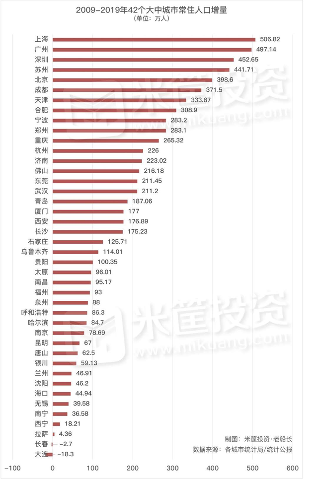 從數(shù)據(jù)來看,人口增量比較大的城市集中在浙江,江蘇,廣東這些發(fā)達(dá)地區(qū),上海是近十年人口增量最大的地區(qū)。而東北特別是大連,長春,人口出現(xiàn)了負(fù)增長。