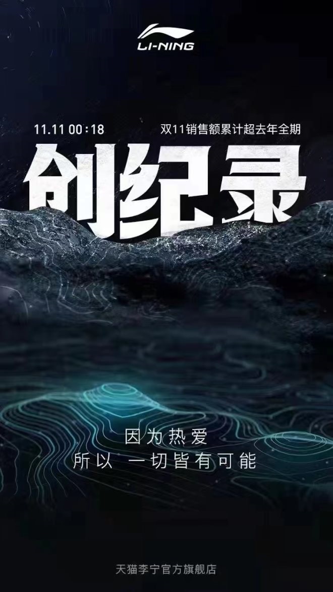 聯(lián)商快訊:11月11日,李寧集團(tuán)發(fā)布了最新戰(zhàn)報,截至11月11日00:18,天貓李寧官方旗艦店雙11銷售額累計超去年全期,創(chuàng)下最新記錄。