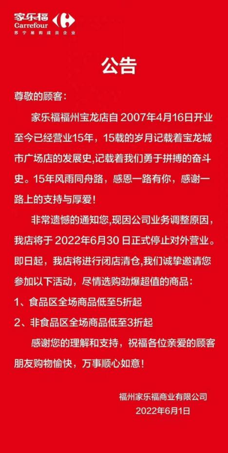 6月1日消息,福州家樂福商業(yè)有限公司發(fā)出公告,宣布其位于福州寶龍廣場的門店將于6月30日正式停止對外營業(yè)。