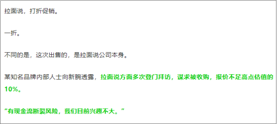 某知名品牌內(nèi)部人士向自媒體《新腕兒》透露,拉面說(shuō)方面多次登門(mén)拜訪,謀求被收購(gòu),報(bào)價(jià)不足高點(diǎn)估值的10%。