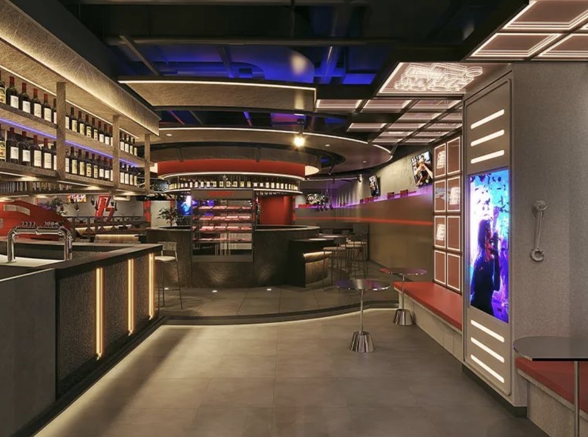 首店以紅色、金色、銀色三種色調(diào)為主,整體呈工業(yè)現(xiàn)代風(fēng),在空間設(shè)計(jì)上,呷哺呷哺在中庭設(shè)置圓形臺(tái)面,保留了單人桌,四周設(shè)置多人桌。而在服務(wù)設(shè)置上,「趁燒」還設(shè)置了酒吧和茶飲站,并提供自制酒水和飲品,不知道呷哺呷哺未來是否會(huì)進(jìn)入茶飲賽道。