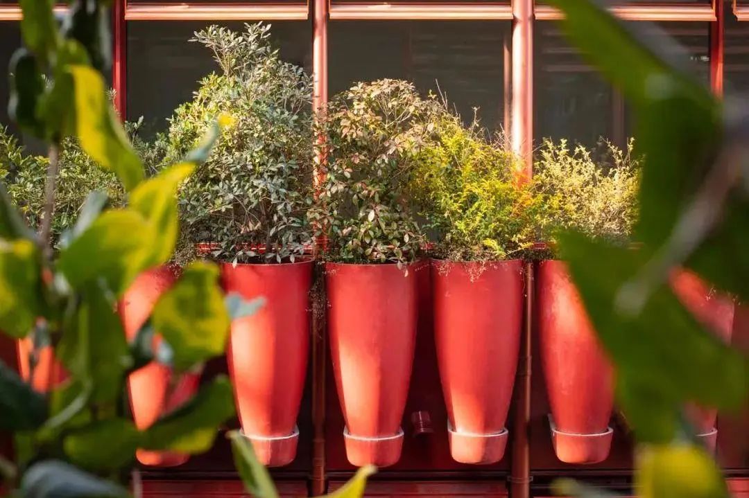 由于花缽是秩序性水平垂直排列在立面之上,若再輔以規(guī)整排列的植物,會(huì)顯得呆板拘謹(jǐn)。因此,項(xiàng)目團(tuán)隊(duì)決定以植物的高矮層次差異營(yíng)造變化。
