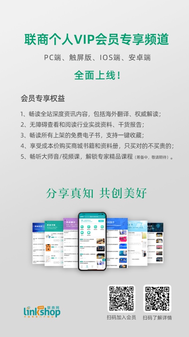 基于此,去年年底,聯(lián)商網(wǎng)推出了面向個人會員的服務(wù)體系。在“分享真知,共創(chuàng)美好”的slogan指引下,全新創(chuàng)立的聯(lián)商個人VIP會員專享頻道設(shè)立了聯(lián)商翻譯、聯(lián)商專欄、聯(lián)商資料、聯(lián)商報告、電子書、聯(lián)商書城等板塊,力求為用戶提供更專業(yè)、更有份量、更具價值的服務(wù)。在這里,會員可以暢讀全站深度文章、行業(yè)實(shí)戰(zhàn)資料、干貨報告等精選內(nèi)容,我們更為每一位會員提供一對一專屬服務(wù),并不間斷為會員創(chuàng)造各項(xiàng)驚喜福利。
