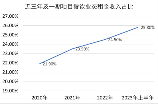 商場(chǎng)運(yùn)營管理費(fèi)收入方面,2020年度、2021年度、2022年度及2023年1-6月,原始權(quán)益人分別實(shí)現(xiàn)3.79億元、4.18億元、5.21億元和2.89億元,占總營業(yè)收入的比重分別為24.74%、25.03%、30.03%和32.58%。