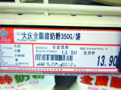 30日中午,記者來到北京華聯埃德蒙頓店。在奶粉貨架上記者看到了價簽為“會員價13.9元、非會員價13.5元”的大慶牌全脂甜奶粉。隨后記者找到了該超市的客服部孟經理,孟經理在進入超市賣場了解到情況后表示,這張價簽是23日貼上的,是由于工作人員的疏忽打錯了,而負責該區(qū)域的主管放假回家沒有及時發(fā)現。孟經理表示,超市已經更換了新的價簽。