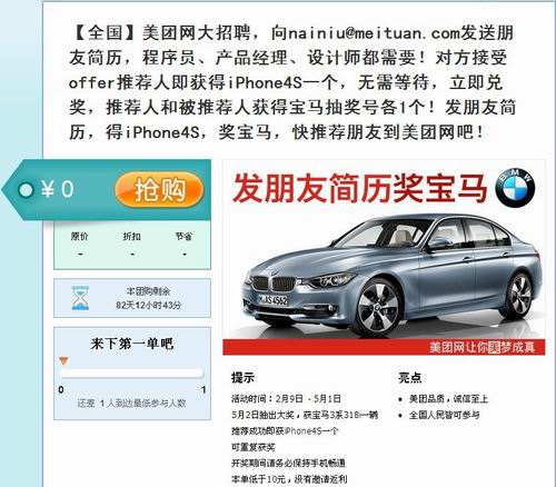 據(jù)介紹,美團網(wǎng)這次“招聘團購,重獎推薦人”的活動會持續(xù)82天,從2月9日起直到4月30日。美團網(wǎng)會在5月2日(周三)抽出寶馬3系318i大獎1名。由于參加寶馬抽獎的均為推薦成功者,遠(yuǎn)少于普通抽獎單的參與人數(shù),因此中獎率堪稱史上最高。同時,美團網(wǎng)在中獎的詳情描述中也強調(diào),面試成功之后,無需等待對方入職就可獲得蘋果手機。這著實讓人感到誘惑。