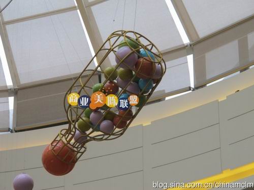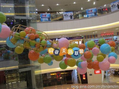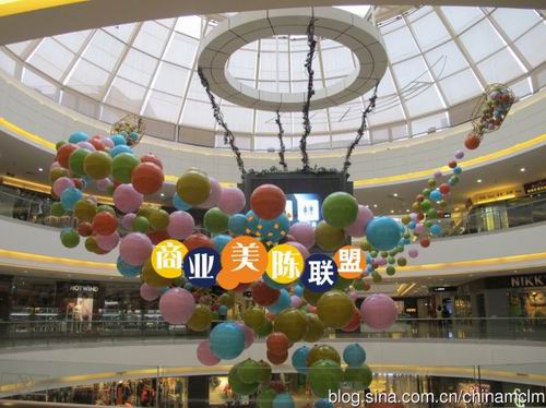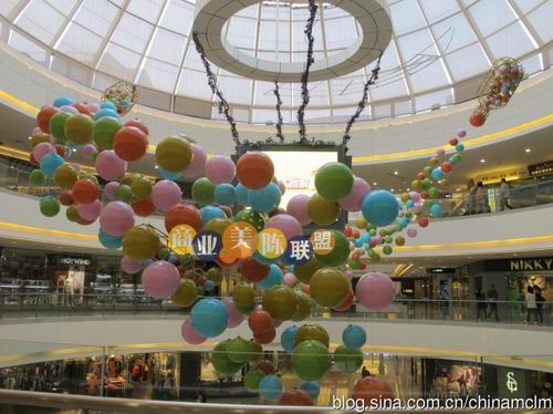 中空----紅、黃、藍(lán)、綠、粉,色彩絢麗的小球繽紛跳躍,仿佛由兩旁的瓶子傾瀉而出,跳躍出一道絢爛的彩虹,組合出一條色彩艷麗的河流,奔騰著,歡唱著,滂沱大氣,歌出了春季的活力,炫出了商場的魅力。
