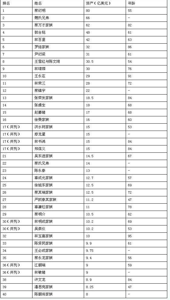 福布斯網(wǎng)站最新公布了2012年臺灣富豪排行榜,在這40人富豪榜單中,旺旺集團的創(chuàng)始人蔡衍明奪得了臺灣首富的桂冠,凈資產(chǎn)為80億美元。頂新集團的魏氏兄弟以資產(chǎn)66億美元排名第二,富邦集團的蔡萬才家族62億美元排名第三,鴻海集團的郭臺銘48億美元排在第四位。