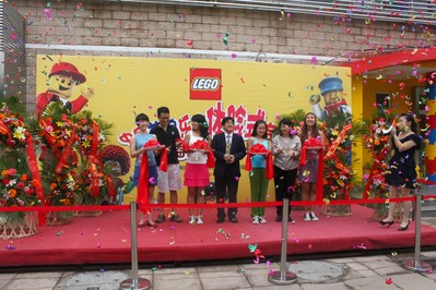 樂高中國(guó)區(qū)域總監(jiān)任啟枝(左四)參與國(guó)內(nèi)首家樂高體驗(yàn)式專賣店的開幕剪彩儀式