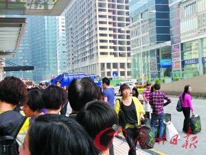 由于等待年度折扣日的顧客多,商場(chǎng)不得不采用鐵柵欄等限流措施。有不少顧客在烈日下?lián)蝹憧嗟取5搅松衔?1點(diǎn),還有排隊(duì)2小時(shí)沒能進(jìn)場(chǎng)的顧客,而隊(duì)伍僅縮小了不到100米。這樣的長(zhǎng)龍,一直排到了下午4點(diǎn)半,多數(shù)內(nèi)地旅游大巴的集合時(shí)間后才減小。