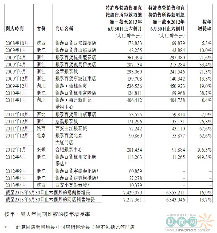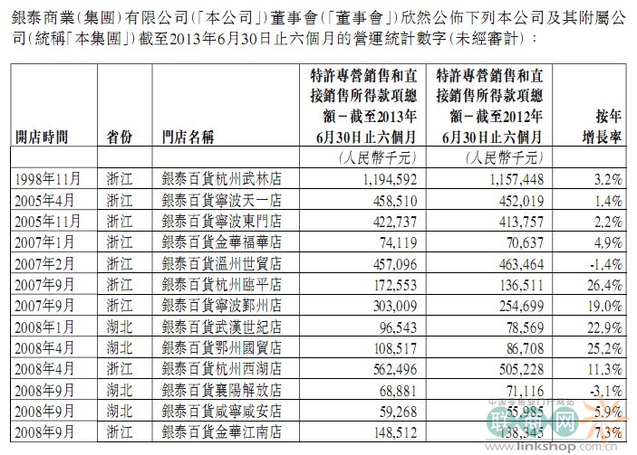 聯(lián)商網(wǎng)消息:銀泰商業(yè)昨日發(fā)布公告稱,前六個月總銷售額74.29億元,按年增加16.9%,同店銷售增長13.7%。銷售主力軍仍在浙江省內(nèi)。報告顯示,上半年銀泰百貨共有20家店面銷售額過億元,其中15家均位于浙江。2011年底開業(yè)的北京大紅門銀泰百貨銷售額為9086萬元,較上年同期5587萬元增加了62.6%。