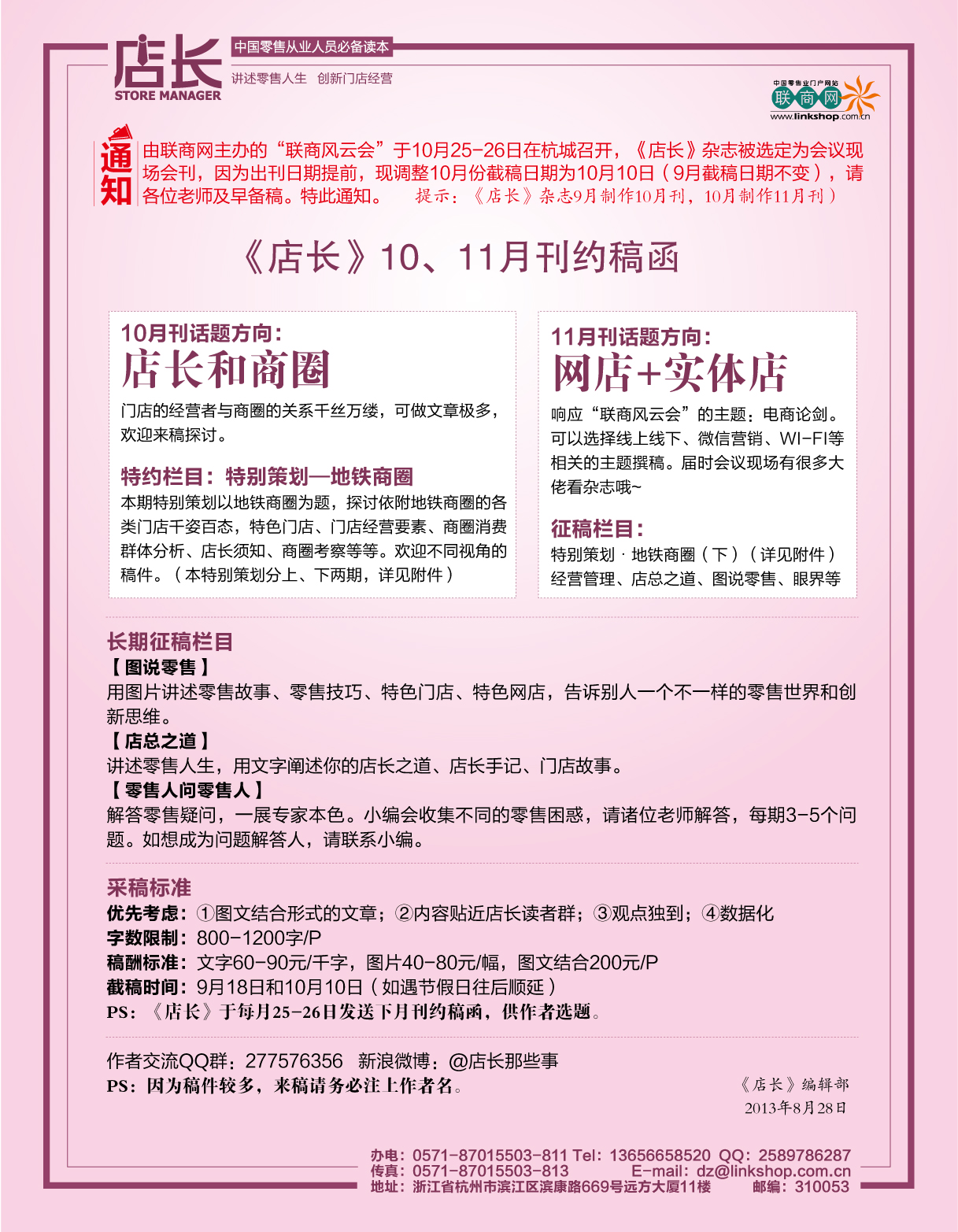 十月刊與十一月刊的約稿工作開始啦,大家注意啦,由聯(lián)商網主辦的“聯(lián)商風云會”于10月25-26日在杭城召開,《店長》雜志被選定為會議現(xiàn)場會刊,因為出刊日期提前,現(xiàn)調整10月份截稿日期為10月10日(9月截稿日期不變),請各位老師及早備稿。