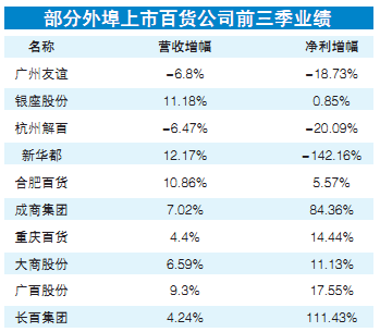 在經(jīng)歷了去年凈利的普遍縮水,今年前三季度百貨企業(yè)業(yè)績(jī)雖有好轉(zhuǎn)但整體走勢(shì)不夠樂(lè)觀。北京商報(bào)記者昨日調(diào)查發(fā)現(xiàn),在已發(fā)布前三季度財(cái)報(bào)的外埠百貨上市公司中,銷(xiāo)售額增長(zhǎng)普遍乏力,平均增幅僅為7.9%。