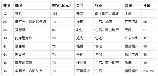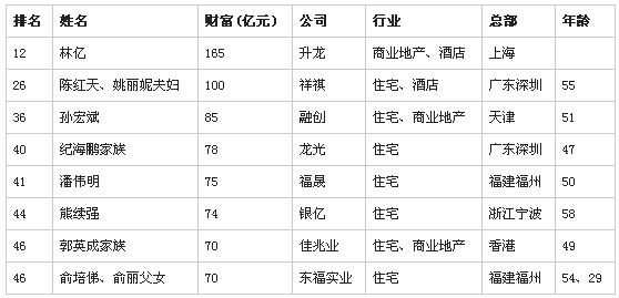 去年上榜今年沒上榜的房地產(chǎn)富豪 有8位,因?yàn)闆]有夠上65億元的上榜門檻而沒有上榜,他們是:廣匯集團(tuán)的孫廣信、億達(dá)集團(tuán)的孫蔭環(huán)、協(xié)信控股的吳旭、明發(fā)集團(tuán)的黃煥明、蘇寧環(huán)球的張桂平、張康黎父子、金科地產(chǎn)的黃紅云、仲盛的葉立培和創(chuàng)鴻集團(tuán)的黃鴻明。
