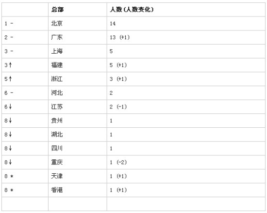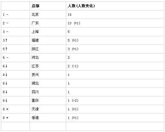 從總部所在城市來看,北京絕對第一,其次是廣州,有7位。