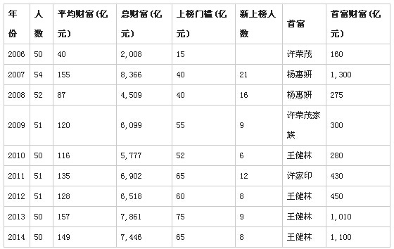◆ 平均財(cái)富、上榜門檻皆有所下調(diào)。前50名的平均財(cái)富比去年下降5%,為149億元。前50名上榜門檻比去年降低13%,為65億元,回到2011年的水平。身價百億及以上的人數(shù)比去年減少3位,到30位。