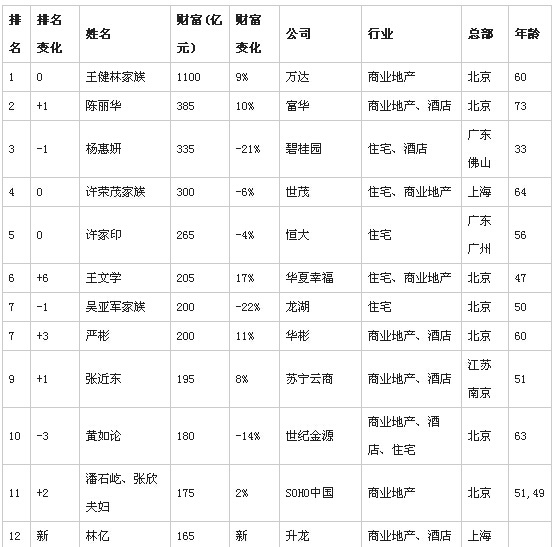 前十名房地產(chǎn)富豪平均財(cái)富336.5億元,和去年前十名的平均財(cái)富差不多。前十名中連續(xù)兩年只有1位新人,今年是47歲華夏幸福的王文學(xué)新進(jìn)入前十。前十名中,有3位持有物業(yè)量較大,分別是王健林、陳麗華和黃如論。前十名中有一半企業(yè)的房地產(chǎn)部分未上市,上市的一半中有4家是在香港上市的。前十名中總部在北京的有6家,其次是廣東,有2家。前三名中2位女富豪。