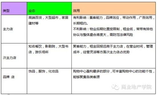 e.招商目標(biāo)客戶主次分明,首先要確定主力店群,主力店群一般由若干家大型品牌店組成,多數(shù)以知名度較商的有良好業(yè)績的大型商超或其它服務(wù),娛樂機(jī)構(gòu)等業(yè)態(tài)出現(xiàn)。經(jīng)營面積占全場營業(yè)面積的1/3至1/2,面積過大,則容易帶來較大的風(fēng)險(xiǎn)。