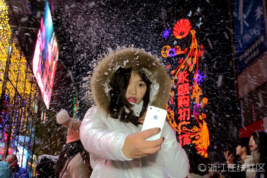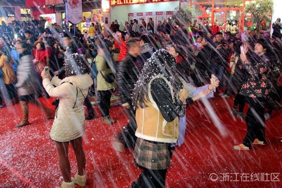 12月12日晚上,浙江省金華市區(qū)西市街上,一群身戴潔白翅膀的“天使”,伴隨著漫天“飛雪”降臨街頭,讓逛街的市民大飽眼福。這是當(dāng)天晚上,市區(qū)一家百貨商場(chǎng)為周年店慶策劃的一場(chǎng)視覺(jué)盛宴,圍觀市民在盡情地嬉“雪”狂歡的同時(shí),紛紛拿相機(jī)或手機(jī)拍照留影,把整條步行街?jǐn)D得水泄不通。