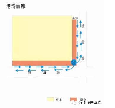 萬科金色家園和港灣麗都的主力店與社區(qū)主出入口雖然相距較遠(yuǎn),但由于商業(yè)分布較長,兩者都能吸引人流經(jīng)過大部分商業(yè),仍是以主力店作為人流焦點(diǎn)。