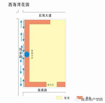 西海灣花園和萬科四季花城主力店與社區(qū)主出入口相距較近,兩者形成一個整體,作為人流焦點(diǎn);