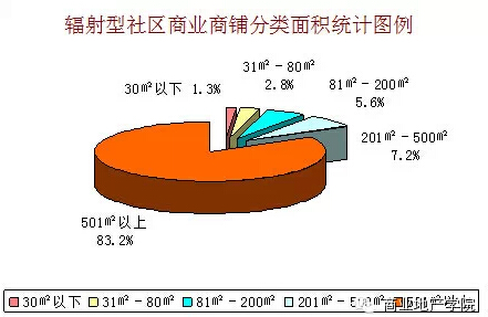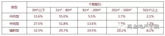 內(nèi)向型社區(qū)商業(yè)中面積區(qū)間較大的鋪位面積比例下降較多,主要由于內(nèi)向型社區(qū)商業(yè)的對外輻射力較弱,一些輻射面廣且經(jīng)營面積較大的業(yè)態(tài)比例會相應(yīng)的較少。