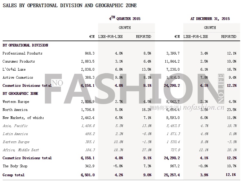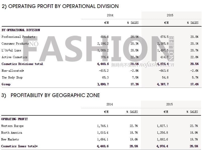 截止2015年12月31日2015財年L’Oréal SA 歐萊雅集團收入錄得3.9%的可比增幅,受益疲軟歐元實際增幅達(dá)12.1%至252.574億歐元,固定匯率增幅4.9%;營業(yè)利潤錄得12.8%的增幅,由2014年的38.907億歐元增至43.877億歐元,符合市場預(yù)期,營業(yè)利潤率17.4%有10個基點的增幅;毛利率71.2%,同樣有10個個基點的增幅,毛利潤增長12.2%至179.800億歐元,2014年為160.313億歐元。