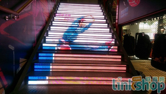 店鋪共分兩層,引用潮流化的店面設(shè)計(jì),外立面采用可透視的玻璃幕墻,店鋪內(nèi)設(shè)有LED屏幕,注重使用對(duì)比鮮明的色彩來(lái)構(gòu)造充滿活力的環(huán)境,樓梯上滾動(dòng)著各種李寧品牌服飾的廣告,非常年輕化和動(dòng)感。