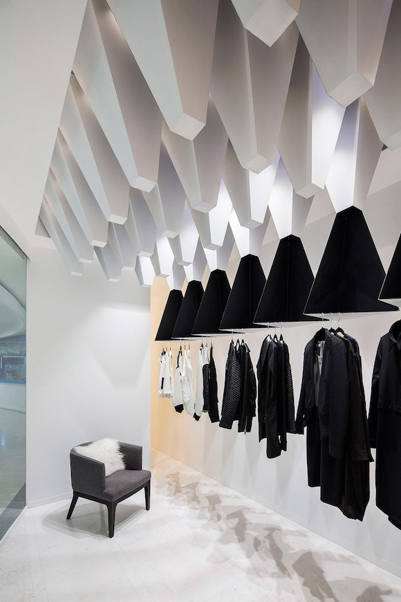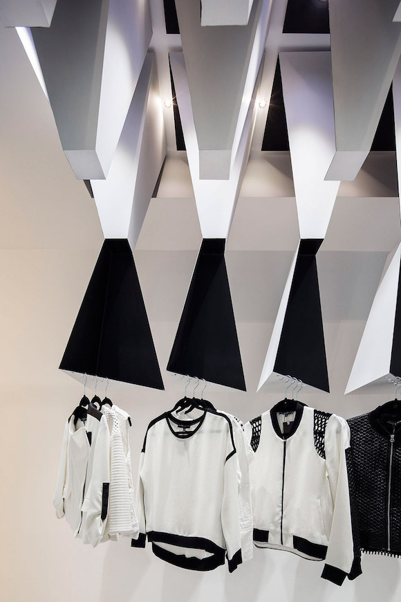 除了看上去特別,這些棱面還為門店提供了特殊的衣架。這本身也是一個(gè)吸睛點(diǎn),而且由衣架顧客也更容易注意到天花板上留下的巧思。