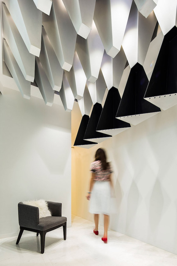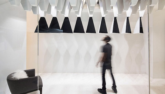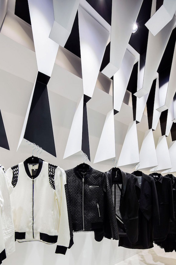 但這不免讓整家店看上去有些無(wú)聊。在飽受電商夾擊,實(shí)體零售店鋪越來(lái)越難經(jīng)營(yíng)的當(dāng)下,一個(gè)平淡的服裝店顯然沒(méi)有一點(diǎn)競(jìng)爭(zhēng)優(yōu)勢(shì)。于是, Massive Order 決定在門店的天花板上好好下一番功夫。正如現(xiàn)在所能看到的,門店最終的天花板有一整片凸起的幾何體,盡管仍是黑白色,卻利用棱面做出了特別的視覺(jué)效果。