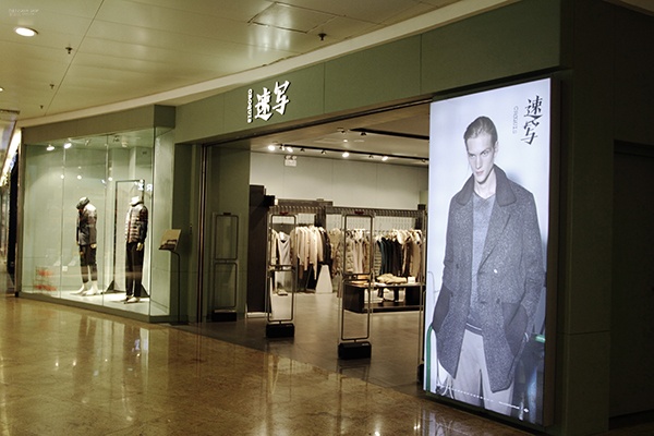 門臉與櫥窗:簡約凸顯服裝本身特色的簡約櫥窗設計風格;巨型海報的運用令品牌在整個男裝區(qū)更引人矚目。
