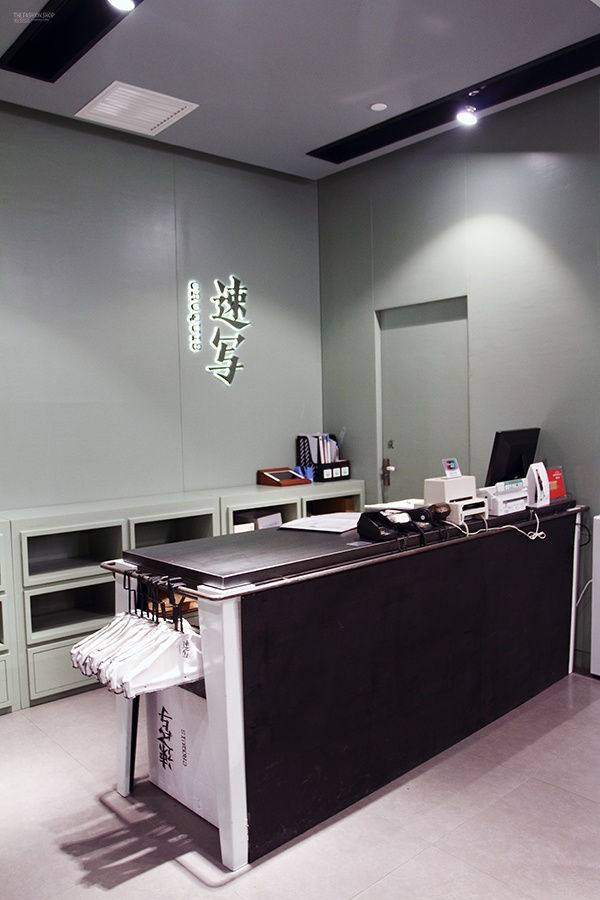 收銀區(qū):收銀臺的背景墻面是復古質(zhì)感的綠色調(diào),讓整個店鋪空間在喧囂的商場中靜下來、慢下來。