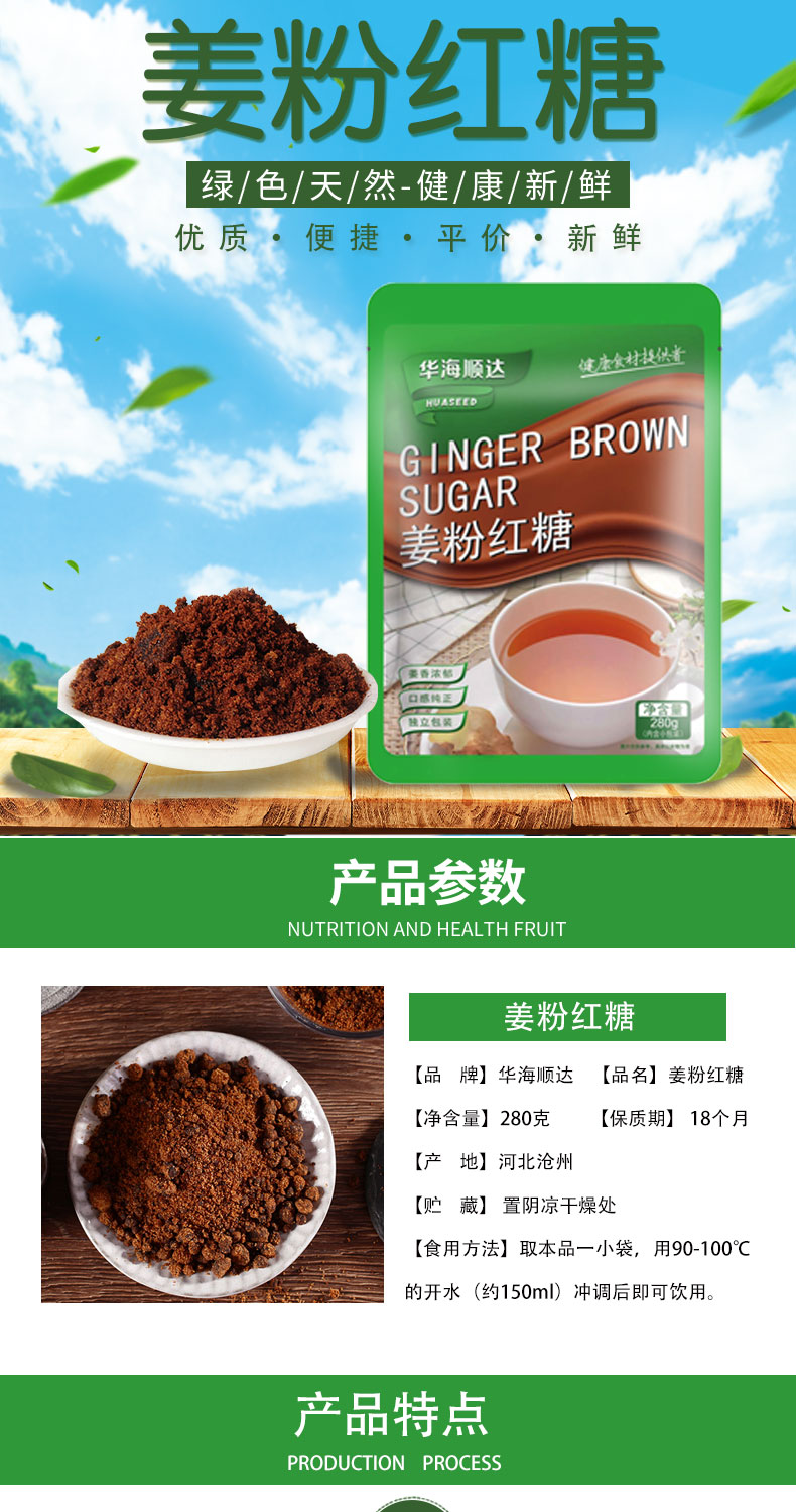 精選優(yōu)質(zhì)紅糖、生姜粉,粉碎、配比、灌裝等程序制成的獨立小包裝的花色紅糖,食用簡單,攜帶方便,易于貯藏,蔗香濃郁,口感醇正,符合廣大消費者需求。
