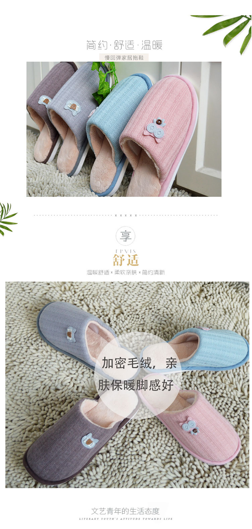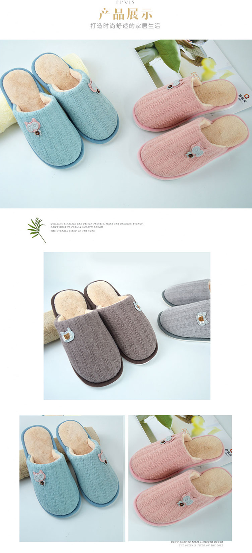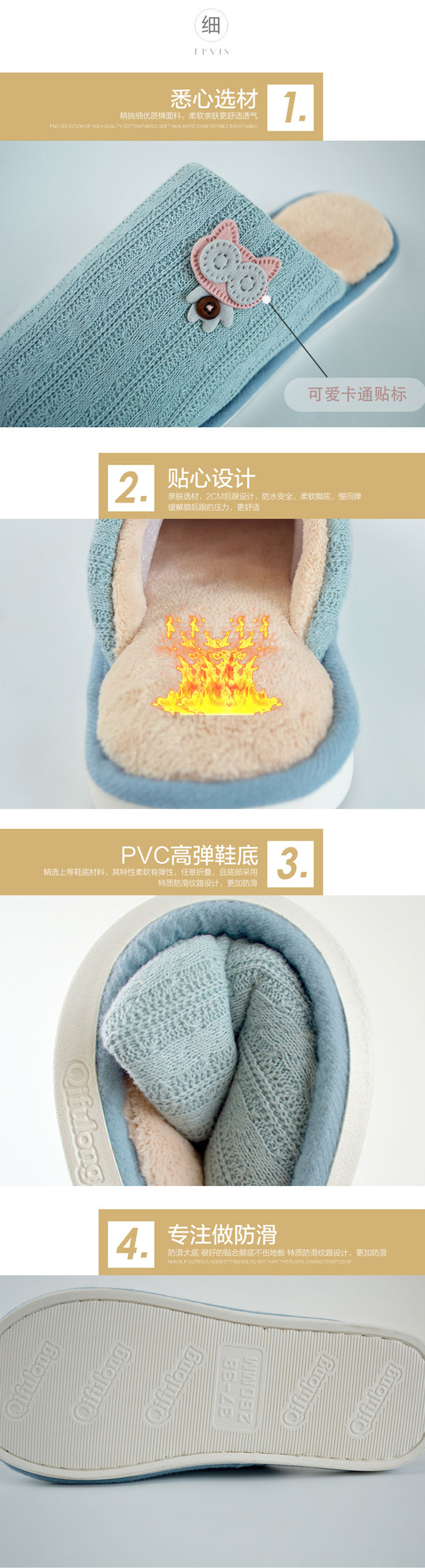 本產(chǎn)品采用滌棉、毛絨、PVC的材質(zhì),舒適、柔軟、保暖,時(shí)尚簡(jiǎn)約的外觀,抗菌除臭產(chǎn)品專利
