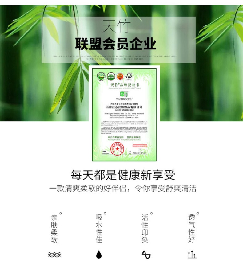 竹纖維是從竹類中提取出來的一種再生植物纖維,是繼棉、麻、毛、絲之后人類應用的的第五大天然纖維。竹纖維性能獨特,因其“綠色”“健康”的形象正成為紡織品市場的新寵。 竹纖維紡織品不需要特殊處理,使用后不霉、不臭、不被腐蝕,生產(chǎn)出的毛巾吸濕透氣、手感柔軟爽滑、綠色環(huán)保,真正為消費者提供了天然、健康舒適的產(chǎn)品。