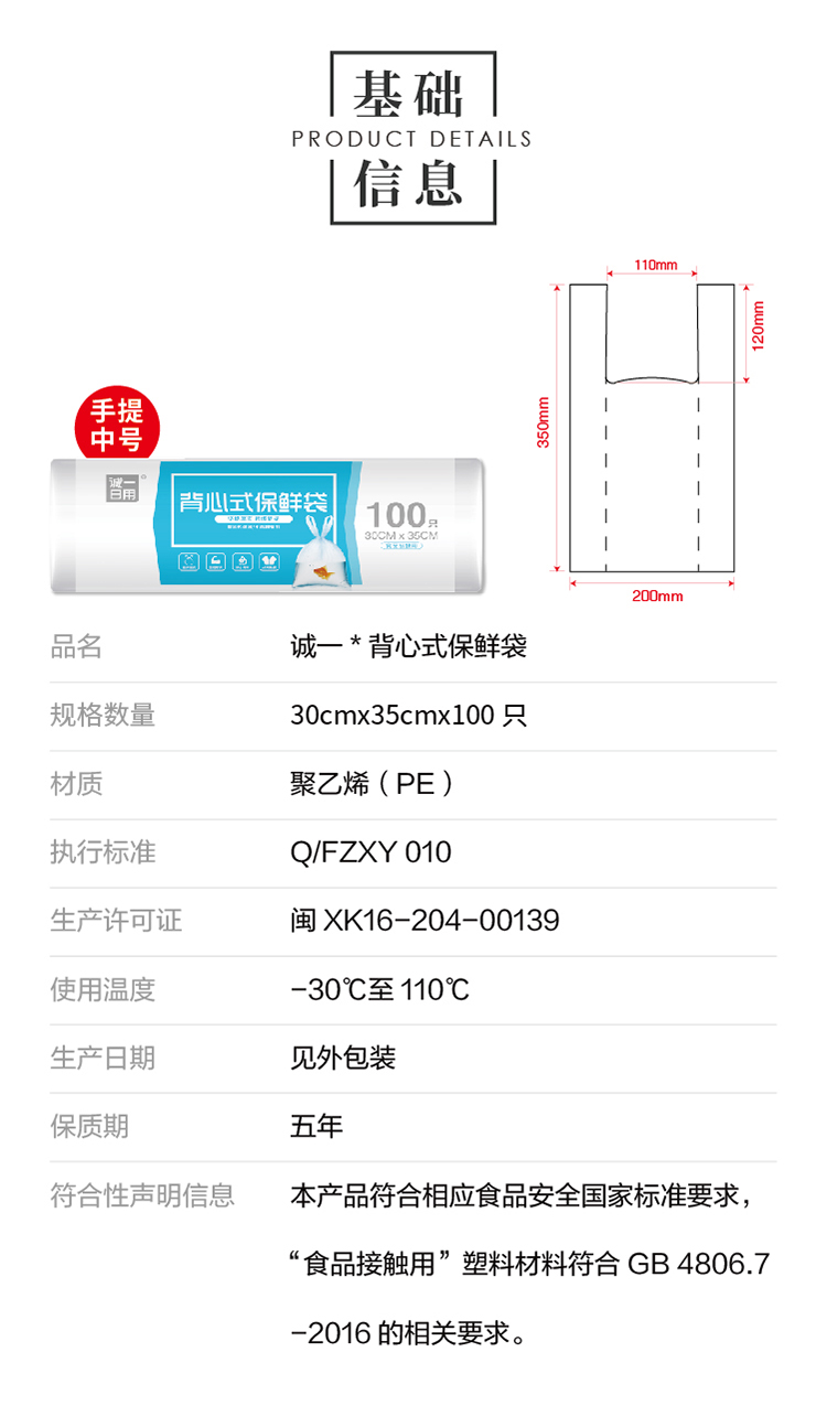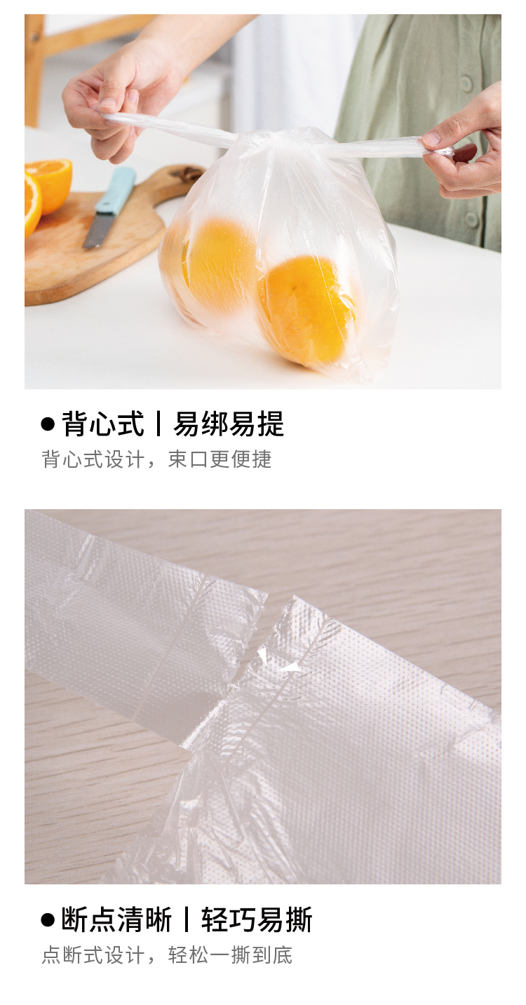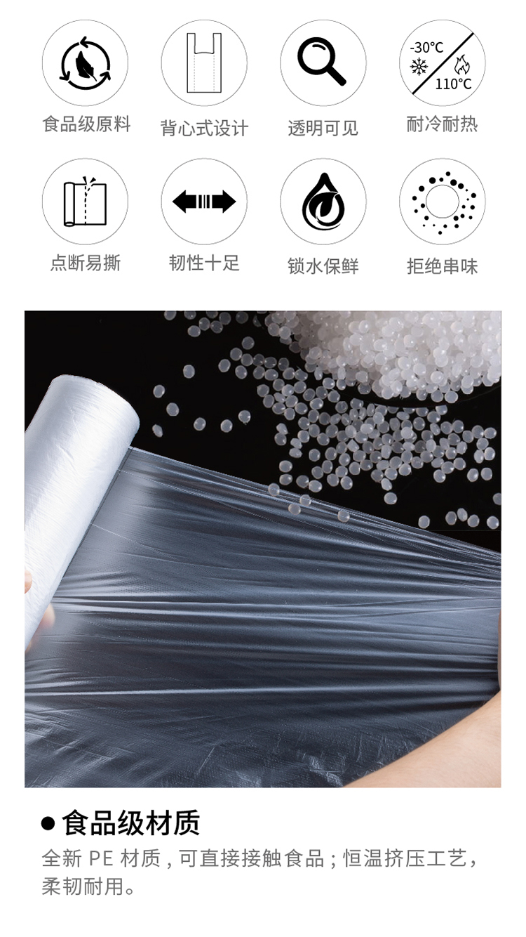 產(chǎn)品賣點: ? 全新PE原料,可直接接觸食品 ? 背心式,易綁易提 ? 加韌加厚,防止破漏,有效隔絕細菌 ? 點斷式設計,輕巧易撕 ? 耐冷-30℃,耐熱110℃